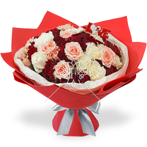 Классические розы алого, нежно-розового и молочно-белого оттенков  выглядят ослепительно прекрасно, восхищают ароматом и чаруют изящностью. Дополняют это совершенство ванильные гвоздики, которые гармонично смотрятся в единой композиции.